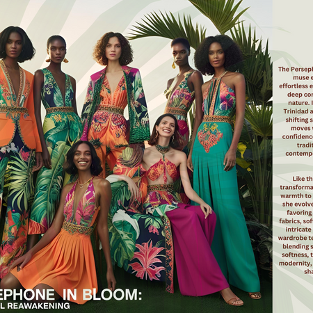 This collection embodies a fusion of Greek mythology and Trinidadian culture, celebrating the eternal cycle of nature's renewal in a tropical paradise. The collection honors Persephone's journey from darkness to light, capturing the essence of resilience, transformation, and the vibrant spirit of the Caribbean. The myth of Persephone, abducted by Hades and returning to her mother Demeter, symbolizes the changing seasons from winter to spring in Greek mythology. In Trinidad and Tobago, a tropical climate devoid of distinct seasons, this myth can be reimagined to reflect the nuances of weather patterns and the vibrant culture of the islands. In "Persephone in Bloom: A Tropical Awakening" mythology finds a new home amidst the vibrant colors and cultural tapestry of Trinidad and Tobago. It is a narrative woven from threads of tradition and innovation, celebrating the resilience of nature and the enduring spirit of a people whose lives are intertwined with the land they call home.